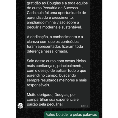 Muito prazer sou Douglas Oliveira pecuarista e Criador do canal Berro do Boi, trabalho com recria e engorda de bovinos de corte a 06 anos em terras arrendadas. Sei como é iniciar pequeno e sem ter fazenda própria, passei pelas mesmas dificuldades que muitos talvez estejam passando nesse momento. Porém eu venci e continuo crescendo na pecuária.